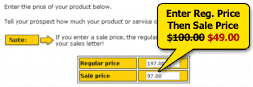 Just enter your regular price (example $100.00) then enter your "sale price" (example $49.00) and the system automatically writes your product price with the higher price crossed out: